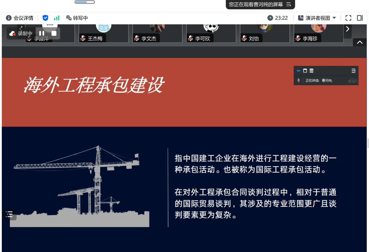 国际商务谈判专业委员会前副理事长、中国国际经济技术发展局沈阳分局常务前副局长、高级经济师曹河纯进行了《海外工程项目承包建设合同谈判要点》为题的主题演讲。他就国际商务谈判比赛的关键规则和经验、工程承包签约谈判的注意事项、工程承包模式、建设内容、计价与支付方式、施工地交通安全、保险条款以及环保和劳工法规等要素等问题展开了讲解。他强调,在谈判中使用明晰准确的术语、确保合同双方法律地位平等以及诚实信用十分重要。