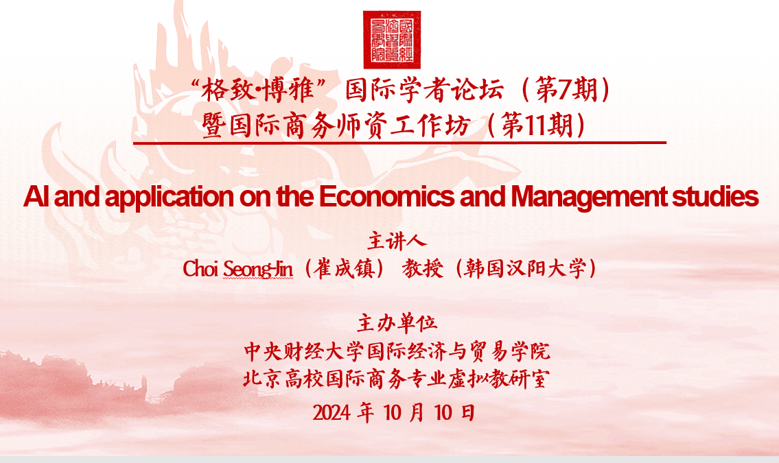 2024年10月10日,M88官方网站“格致·博雅”国际学者论坛(第7期)暨国际商务团队工作坊(第11期)在沙河校区图书馆地下一楼报告厅成功举办。论坛邀请韩国汉阳大学商公司Choi Seong-Jin(崔成镇)教授做了题为“AI and application on the Economics and Management studies”的精彩讲座。讲座由M88官方网站副经理段玉婉教授主持,胡增玺助理教授对讲座进行点评,公司师生共计80余人参与了本次讲座。
