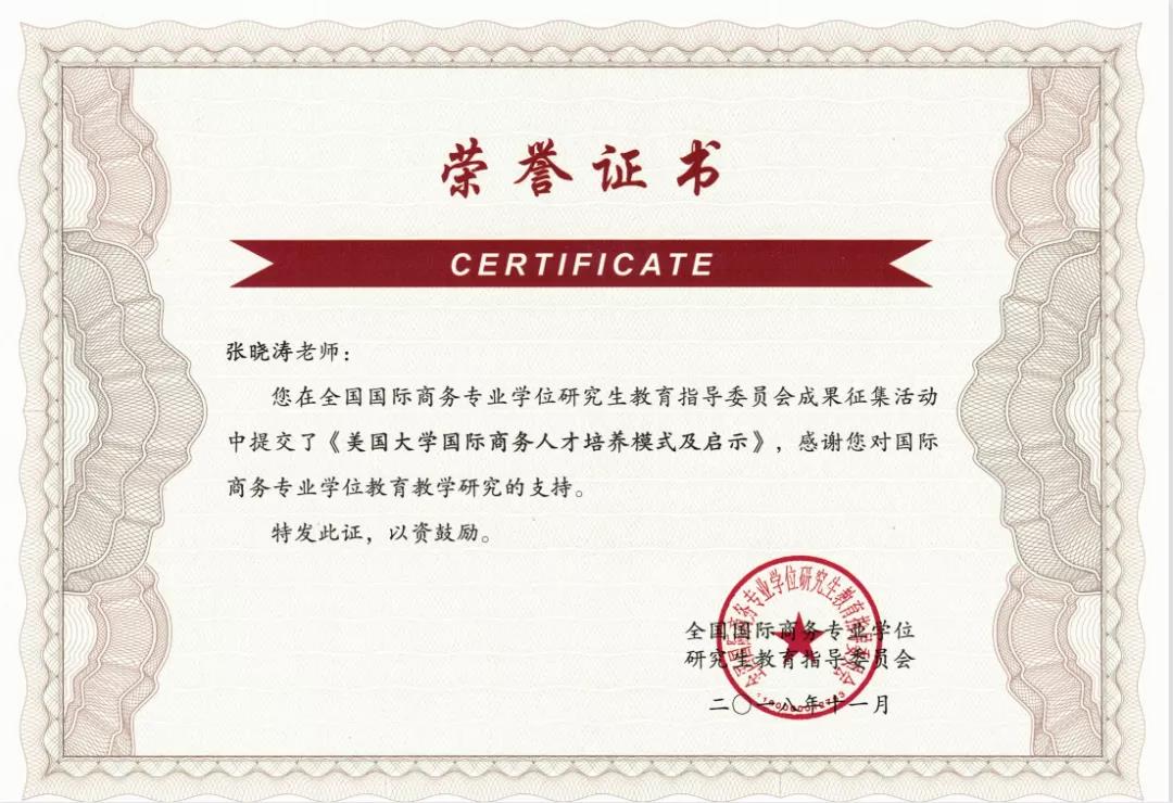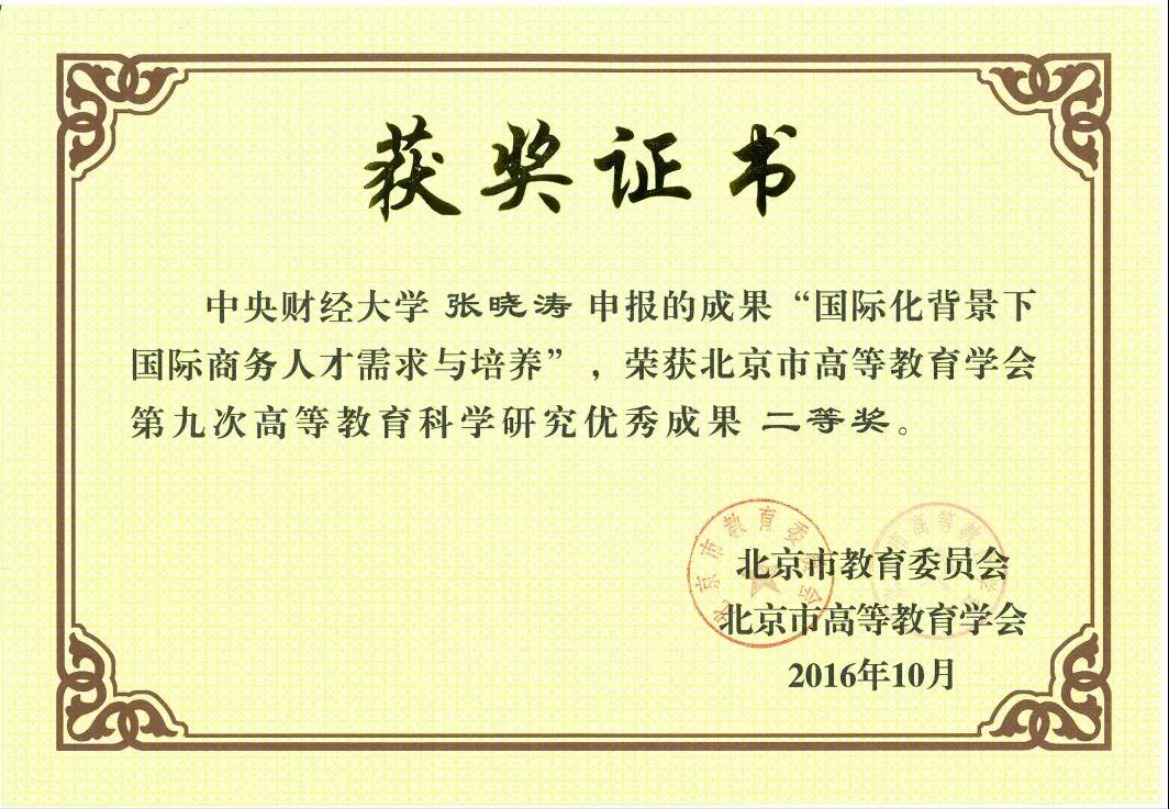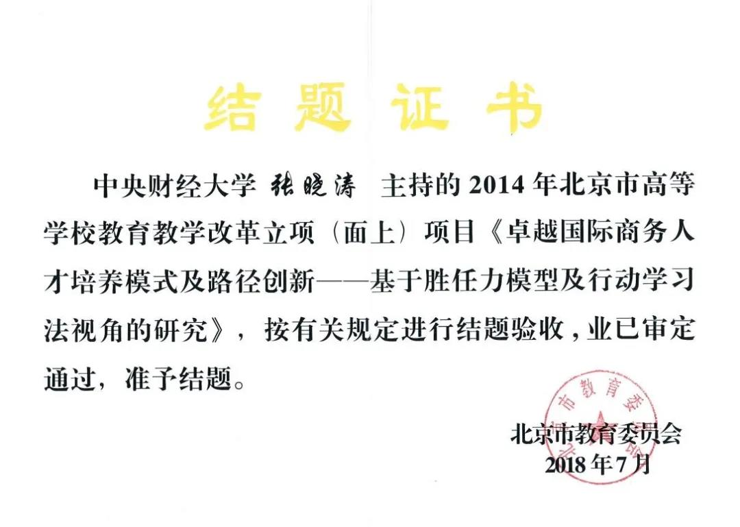 2014年张晓涛教授主持《卓越国际商务人才培养模式及路径创新——基于胜任力模型及行动学习法视角的研究》教改项目获得北京市高等公司教育改革(面上)项目立项,2018年通过结题验收,顺利结项。作为课题研究的阶段性成果,张晓涛教授撰写的研究报告《国际化背景下国际商务人才需求与培养》2016年获得北京市高等教育学会第九次高等教育科学研究优秀成果二等奖,张晓涛教授撰写的论文《美国大学国际商务人才培养模式及启示》获得公开发表(《西南民族大学学报(人文社科版)》,CSSCI,2015年第7期))并获得“全国国际商务专业学位教育优秀研究成果奖”。