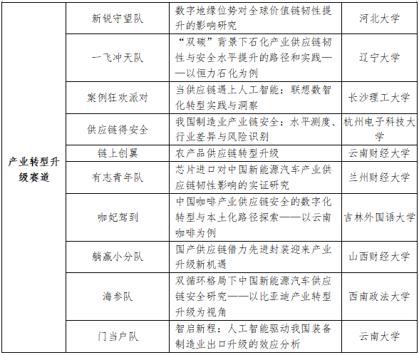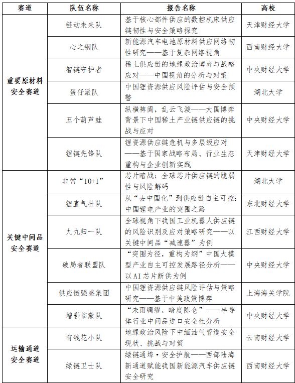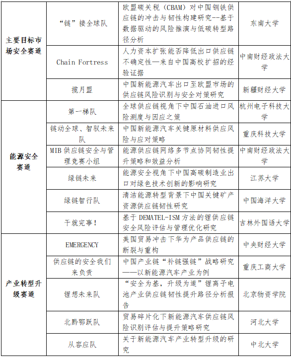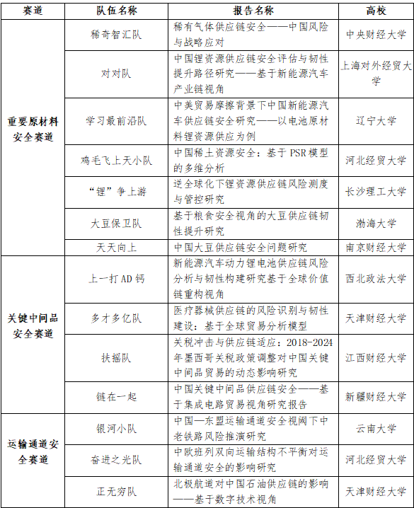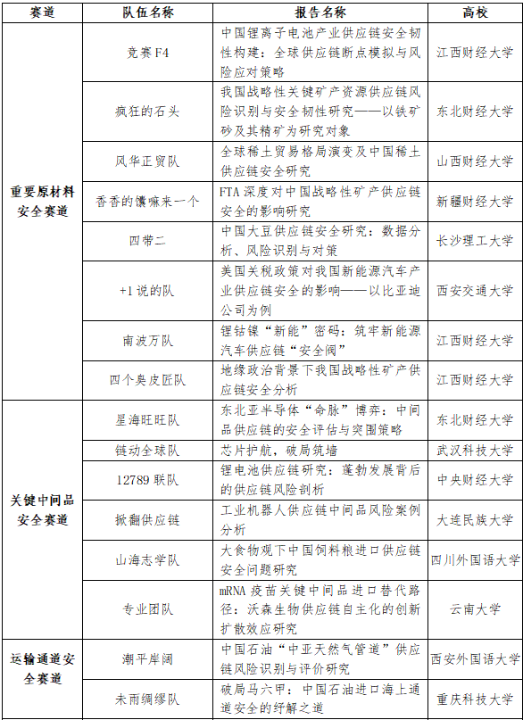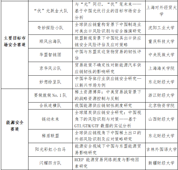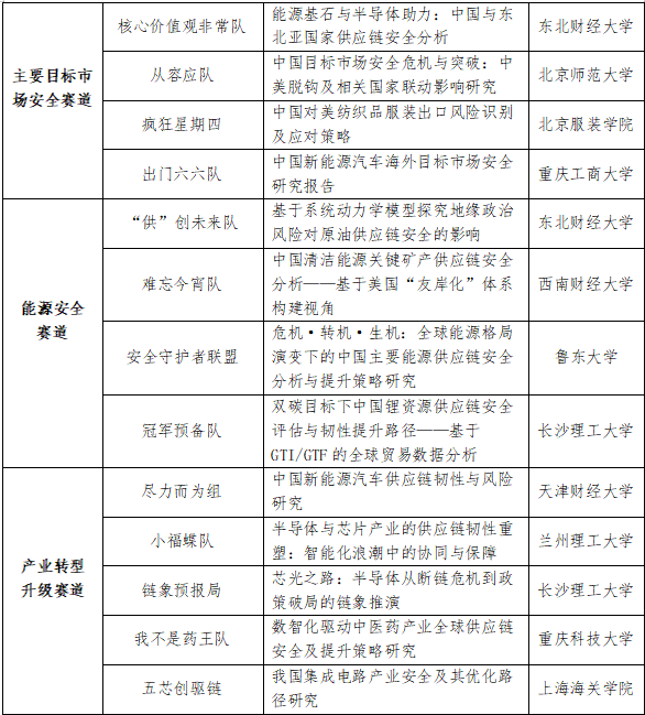 本届竞赛包括“重要原材料安全”、“关键中间品安全”、“运输通道安全”、“主要目标市场安全”、“能源安全”、“产业转型升级”6个赛道,共收到来自全国74所高校183篇参赛作品。经过专家函评,27支队伍脱颖而出,成功晋级决赛。