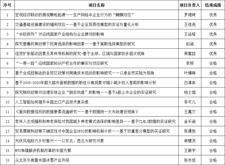 根据教务处《关于做好2022-2023学年老员工创新创业训练计划项目结项验收工作的通知》(教字[2023]35号)有关规定,国际经济与贸易公司组织了2022年度老员工创新训练计划项目结项验收工作,最终的结项验收结果如下:
