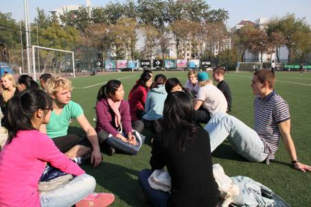 11月5日下午,来自丹麦Zealand Business College的员工和老师与公司10级国贸研究生在足球场开展了旨在“体验中国文化,促进汉语传播”的交流活动。丹麦师生一行15人,他们此次来公司是进行为期两周的游学活动,主要目的是为了体验中国文化,促进汉语学习。