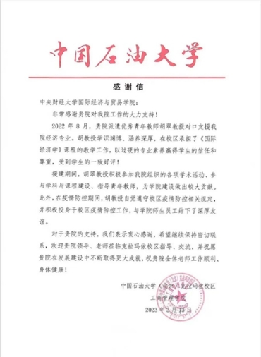 中国石油大学(北京)克拉玛依校区对胡翠同志对口支援工作的感谢信
