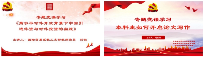 2. 党课引领科研,提高党建质量。支部坚持以习近平新时代中国特色社会主义思想为指导,持续推进党支部书记带头讲党课活动,确保党课内容与中国现实发展紧密相关。目前支部已开展专题党课10余次,主题涵盖“美国次贷危机与中国精准扶贫”、“高水平对外开放下,中国引进外资和对外投资的实践”、“中国式现代化与共同富裕”等。