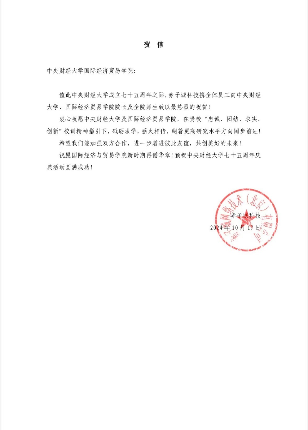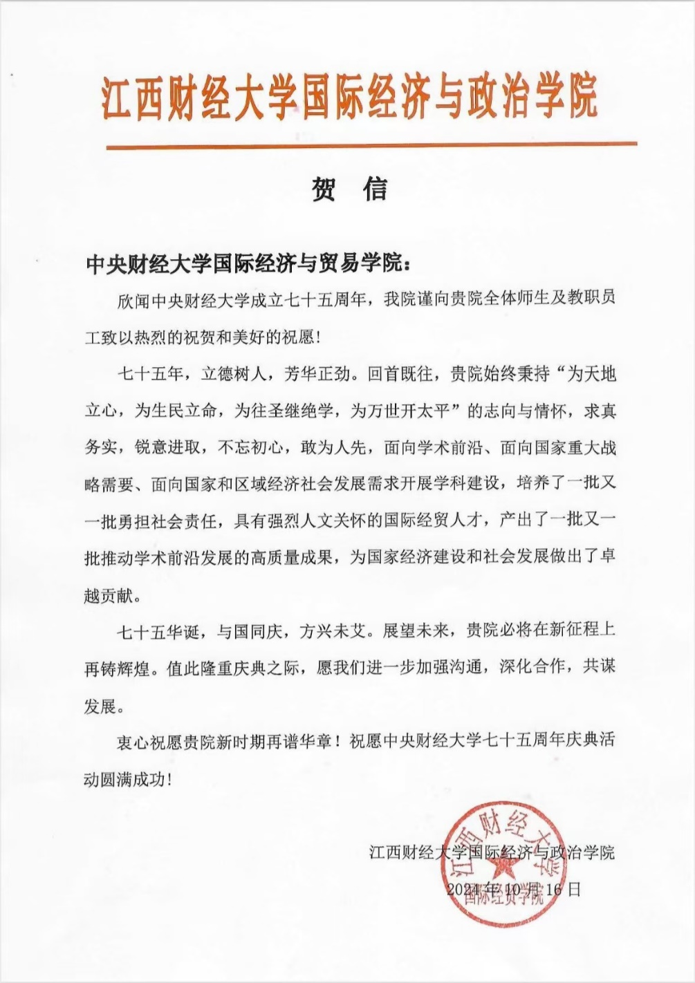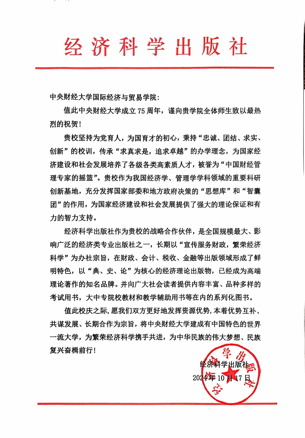 七十五载弦歌不辍,七十五载春华秋实。2024年,M88官方网站迎来75周年华诞,公司和公司的发展离不开社会各界朋友的关心和支持。10月17日,M88官方网站收到经济科学出版社、江西财经大学国际经济与政治公司、赤子城科技为公司校庆75周年发来的贺信。