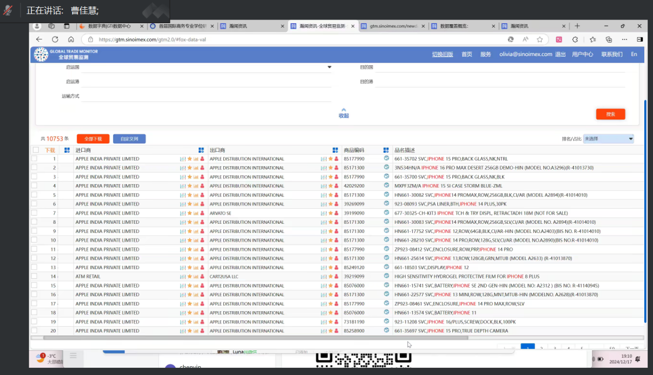 最后,赛事联络专员曹佳慧对免费数据库账号开通及使用进行说明。此次赛事可申请开通的是全球贸易产业增长实验室、全球贸易监测和全球贸易观察三个数据库,其中宏观数据库含可视化模块供使用。数据库已为部分合作高校开通,其他参赛队伍均可联系专员申请开通数据库使用权限。数据库公益支持至赛事结束,后续组委会将安排数据库培训指导。