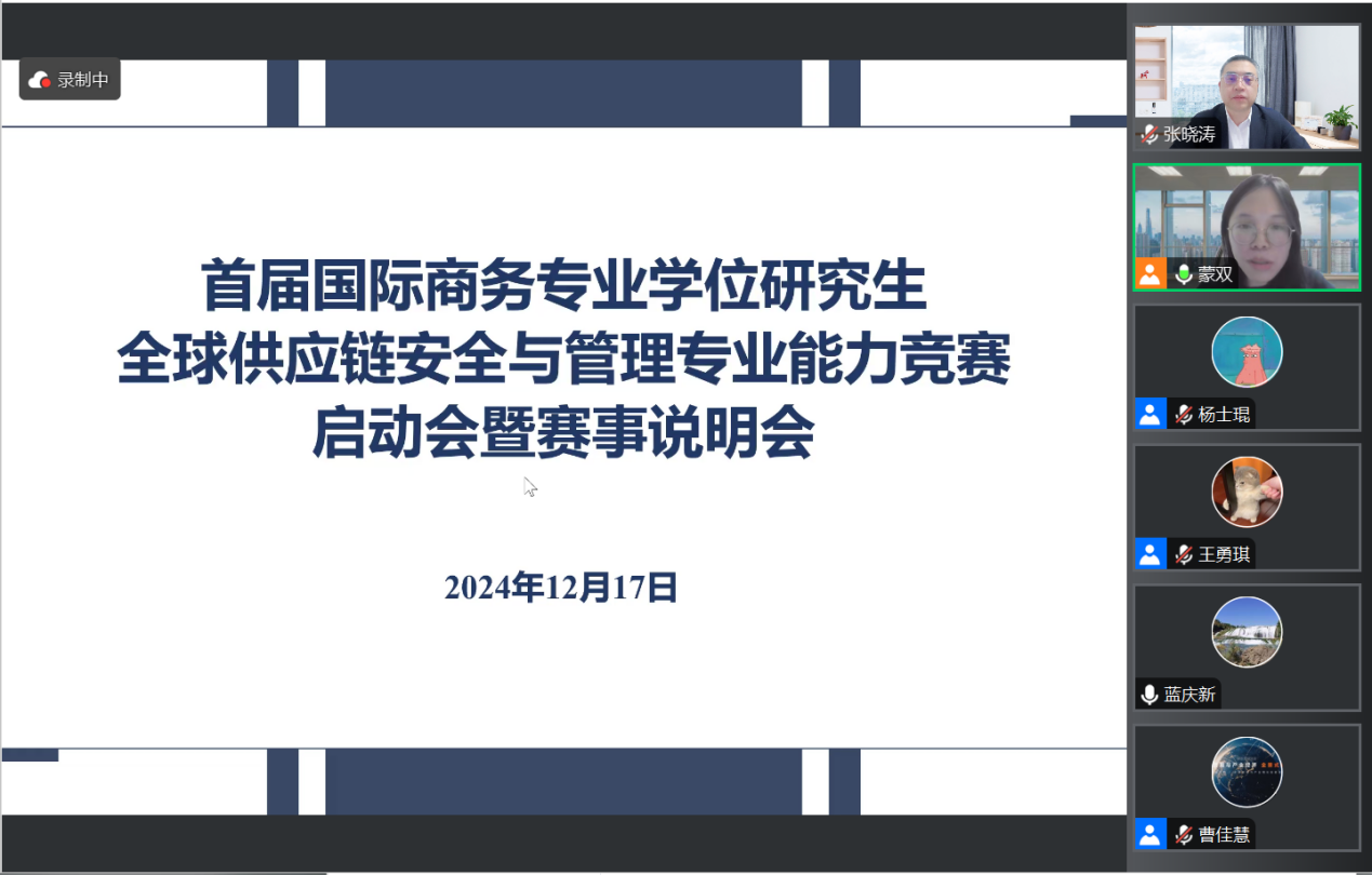 2024年12月17日,首届国际商务专业学位研究生全球供应链安全与管理专业能力竞赛启动会暨赛事说明会成功举办。本届赛事由全国国际商务专业学位研究生教育指导委员会作为指导单位,M88官方网站和大连瀚闻资讯有限公司主办,M88官方网站和北京高校国际商务专业虚拟教研室承办。线上会场有来自全国多所高校的近七百名师生参会。会议由M88官方网站国际商务系教工党支部书记蒙双副教授主持。