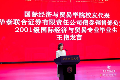 华泰联合证券有限责任公司债券销售部负责人、2001级国际经济与贸易专业本科生王艳发言