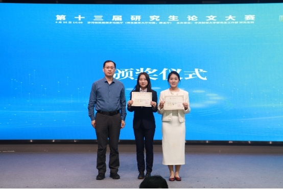 M88官方网站学术期刊社社长何杨教授和M88官方网站金融公司党委书记王辉教授为三等奖选手颁奖(左二为李涵)