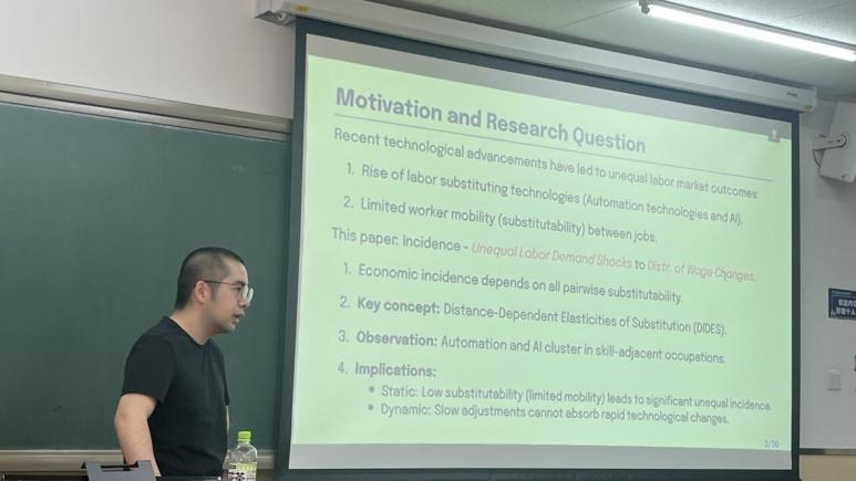 讲座中,范天宇博士详细阐述了技术变革尤其是自动化和AI对劳动力市场的影响。他指出,技术进步带来的劳动替代效应导致劳动力市场结果不平等,而工人流动性受限进一步加剧了这一现象。通过构建Roy模型,范天宇分析了不同技能要求工作间的替代弹性,并借助PSID、ACS、CPS和O*NET等多源数据实证检验了技术变革对劳动力市场的冲击。研究发现,约35-45%的劳动力需求变化反映在工资上,忽视工作间的替代结构会低估工资效应。此外,自动化、AI冲击与中国贸易冲击对劳动力市场的影响各具特点,其中AI若在短时间内集中发生,将对劳动力市场造成更为严峻的挑战。