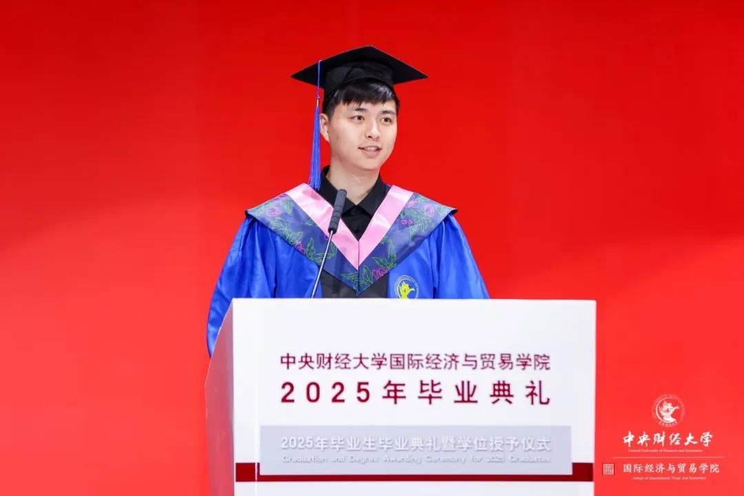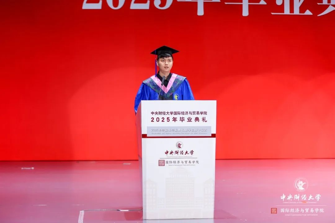 站在毕业这个重要的人生节点,我们比任何时候都更清楚地看到这个时代的机遇与挑战。全球贸易体系深度重构,国际经贸规则加速演进,这既给我们带来了前所未有的挑战,更为国贸学子提供了施展抱负的时代舞台。作为新时代的中财国贸人,无论是选择在学术殿堂继续深耕,还是投身对外开放实践前沿,我们都将始终铭记"为国而生、与国同行"的初心使命。