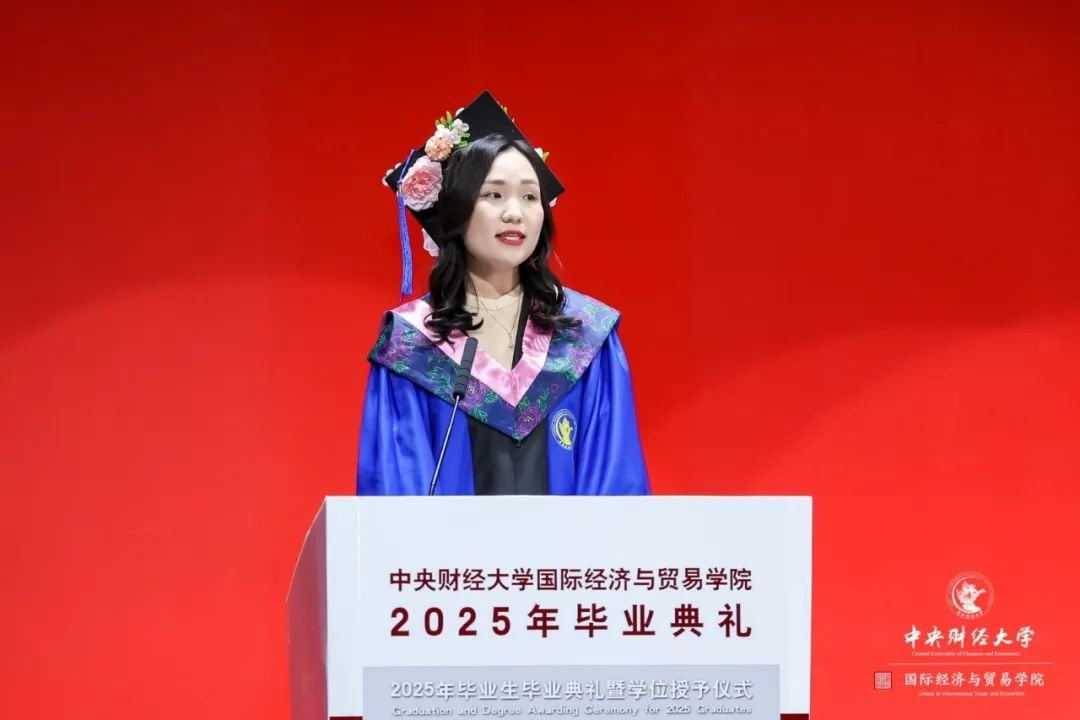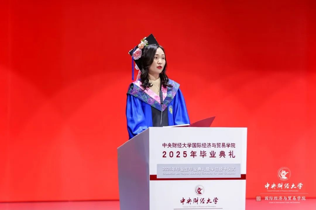 最后,我要向并肩同行的毕业生同学们道一声祝贺!我们跨越山海,汇聚于此,语言肤色各异,却在中财的校园里结下了深厚情谊。难忘挑灯夜战的时光,难忘活动中的思想碰撞,更难忘舞台上的青春绽放。这段同窗岁月,赋予我们的不仅是专业知识,更是沟通协作的智慧、独立思考的勇气,以及一份份跨国情谊。这将是我们一生取之不尽的财富。