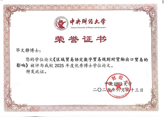 近日,公司公布了2025年M88官方网站优秀博士学位论文名单,公司2025届博士毕业生毕文静的博士学位论文《区域贸易协定数字贸易规则对货物出口贸易的影响》获评“M88官方网站优秀博士学位论文”,指导教师为张晓涛教授,导师组成员为钟腾龙副教授、张龙天副教授与杨补园助理教授。本论文系2024年国家社会科学基金重大项目《全球经贸规则体系变化趋势及对我国高水平开放的影响与对策研究》(项目编号:24&ZD053,首席专家:张晓涛教授)的阶段性研究成果之一,是公司博士研究生服务国家重大战略、参与高水平科研项目的体现,相关研究成果已发表于《经济学动态》等期刊。