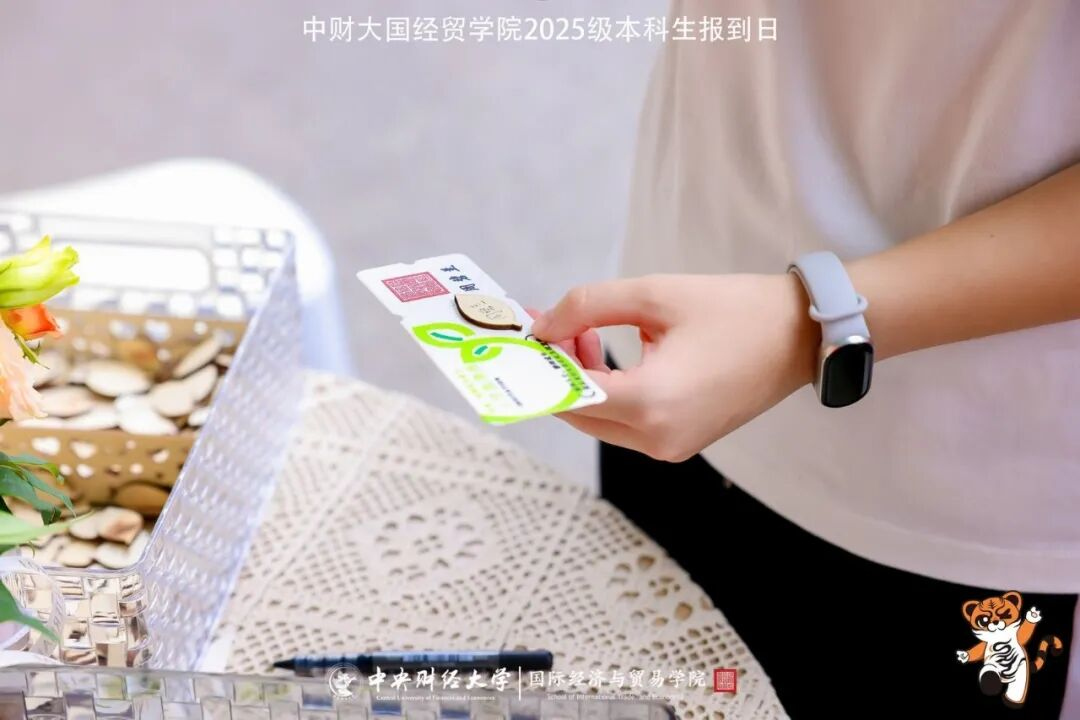 此次迎新,公司特意为新生同学们准备了迎新纪念礼物。志愿者们赠予新生印有国贸公司吉祥物贸贸虎的帆布袋、精致的公司徽章、玲珑的贸贸虎钥匙扣、公司特别编制的《茂才易学,四季耕读:M88官方网站本科生分年级发展指南》,以及印有新生名字的“种子门票”。“种子门票”放入泥土中可抽芽生枝,预示着梦想的种子将在国贸公司的沃土中生根发芽。新生将带着美好的祝愿,踏上大学之旅。此外,新生们在木刻叶片上签名,投入形为“2025”的透明容器。国贸公司似一棵大树,新生是一片片叶,从大树中获得养分,也为大树装点容貌。