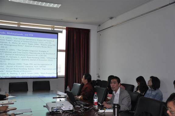 上午,陈博士从Empirical Evidence from Firm and Plant Data; Technology and Trade; Firm Heterogeneity and Trade; Firms, Contracts and Trade; Index Theory and Trade Varieties; Trade and Labor Market; Trade, Multinationals and FDI; Offshoring and Outsourcing; Trade and Immigration; Trade and Capital Market Imperfections; Trade and Environment; Trade and History等几个方面综述了当前国际贸易学术研究前沿。下午,陈博士报告了他最近的一篇工作论文,文章将Feenstra(1995)提出“贸易限制指数”(Trade Restrictiveness Index,TRI)从小国开放经济推广到大国经济,从需求和供给两方面考虑关税的负担,提出“一般贸易限制指数”(Generalized Trade Restrictiveness Index,GTRI)的概念。利用中国海关1997-2008年的数据估计中国进出口商品贸易弹性,并以此计算中国的GTRI,发现了显著的WTO效应,即WTO显著提高了贸易自由化的程度。