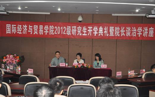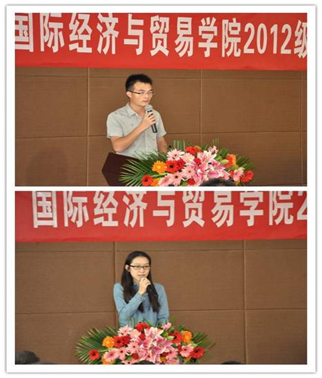 2012级国际贸易学专业研究生杨明健代表全体新生发表了致辞。他从时代的视角分析了80后一代人的特点。面对质疑,他代表新一代人表达了“一定要做好,一定能做好”决心。2011级老生代表徐潇以“昨天的自己,未来的理想”为主题致辞,表达了对学弟学妹的希冀与祝愿,希望学弟学妹们能够主动沟通和学习,保持主动的心态。