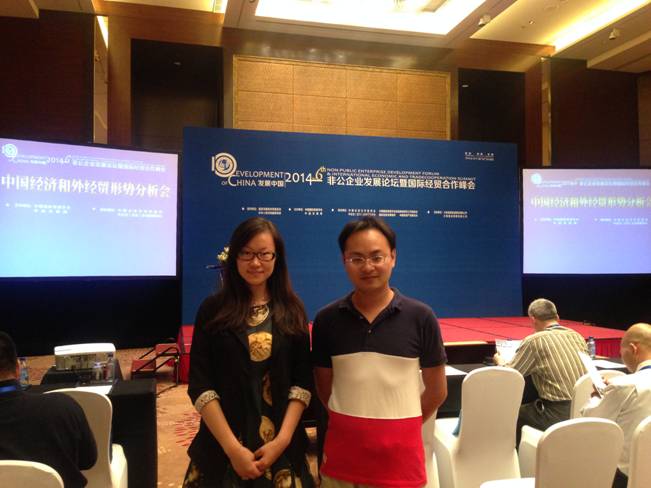 公司青年教师马光明博士与孙瑾博士于2014年9月20日参加了由中国国际贸易学会主办的“中国经济与对外经贸2014秋季形势分析会”。在形势分析会上,中共中央政策研究室经济局局长李连仲、商务部电子商务和信息化司司长李晋奇、商务部政策研究室吴频主任和俄罗斯驻华商务代表格鲁杰夫先生对我国宏观经济、对外贸易、电子商务和中俄经贸合作等进行分析和预测。通过参会学习,两位年轻教师对于当前我国宏观经济形势和国际经贸发展有了更深入的认识。