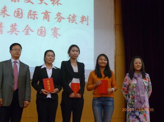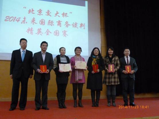 11月22日~23日,公司M88官方网站关婷元、徐熙平、赵治翔、赵梦媛、刘畅、陈竹等6位同学,在指导老师霍达老师的带领下,参加了在北京交通大学举行的2014年未来国际商务谈判精英全国赛并荣获 “一等奖”。同时,霍达老师在此次比赛中荣获“优秀指导奖”,关婷元同学在比赛中荣获“最佳谈判手”称号。