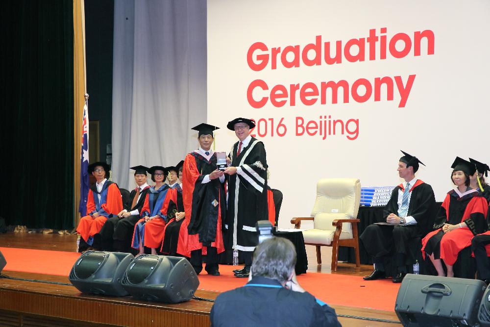 王广谦董事长应邀作为特别嘉宾为毕业生致辞,并接受了由维多利亚大学颁发的百年校庆荣誉勋章,国际经济与贸易公司党总支书记贺培教授、副经理刘春生副教授获颁维多利亚大学特殊贡献勋章,以表彰他们多年来为中澳国际合作项目的辛勤工作。2012级中澳1班的张天予同学代表全体毕业生致辞,并向辛勤培育他们的两校教师、员工家长表示感谢。