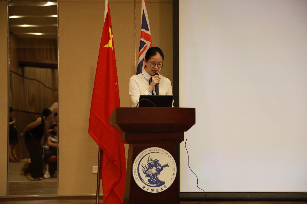 随后,2016级中澳班的徐臻同学代表中澳合作项目高年级员工,与2018级新生分享了自己的思考与感悟。她首先祝贺所有新生能来到心仪的大学,开始人生新的旅程。她认为,当今世界经济面临诸多挑战,中美贸易战持续升级,中国经济进入新常态,这些都需要我们年轻一代肩负起时代的使命。她建议师弟师妹能充分利用中澳项目的优势资源,在优秀老师的带领下畅游知识海洋,不断挑战自我、超越自我。