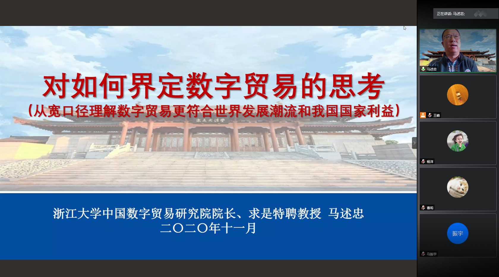 2020年11月4日下午,公司在腾讯会议系统成功举办了“格致·博雅”学术名家论坛(第五期),本次活动邀请了浙江大学中国数字贸易研究院经理马述忠教授做了题为“对如何界定数字贸易的思考”的讲座,讲座由经理张晓涛教授主持,校内外老师和研究生共计130余人参与了本次讲座。