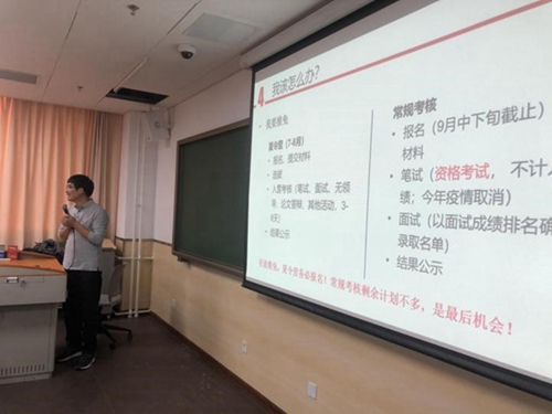 为了加强就业指导工作,实施职业素质教育工程,引导员工开展职业规划,推动优良学风形成,2020年11月4日下午,公司于沙河校区公司楼13号楼321教室隆重举行了龙马职谈第二期暨考研、出国分析讲座活动。此次活动邀请公司研究生院招生办公室主任祝维龙老师为公司各年级本科生进行研究生报考政策形势分析讲座。公司党委书记徐淼老师,党委副书记杨武老师,团委书记范璐君老师,辅导员侯思宇老师以及公司各年级本科生共同出席了本次活动。讲座活动由徐淼书记主持。
