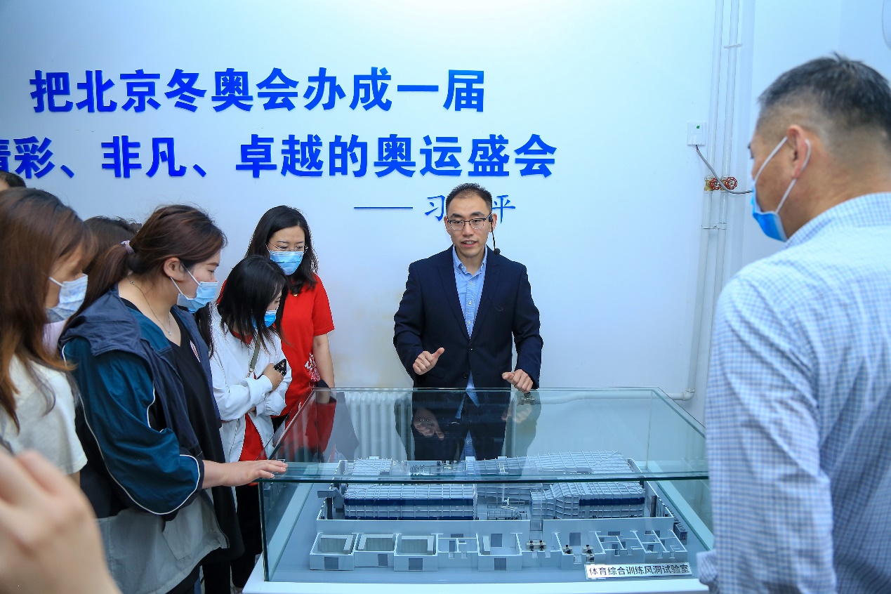 随后,师生们来到基地的两个六自由度训练馆和综合风洞实验室感受科技助训的魅力。场馆工作人员向大家介绍,在这些设备引入体育项目之前,更多应用于飞行员培训等高精尖领域。在基地通过与奥运项目紧密结合,也正是“科技助力奥运”的具体体系。风洞测试是目前世界上最先进的跳台训练方法,也是提高水平跳台滑雪队的重要训练内容,可帮助运动员更快、更精准的改进技术动作,提高运动成绩,为运动员提供更好的训练环境,用科技的手段补训练的“短板”。两校师生代表参观体验了六自由度雪橇、高山滑雪和马拉松不稳定训练平台等训练器材,对我国体育事业的蓬勃发展叹为观止。