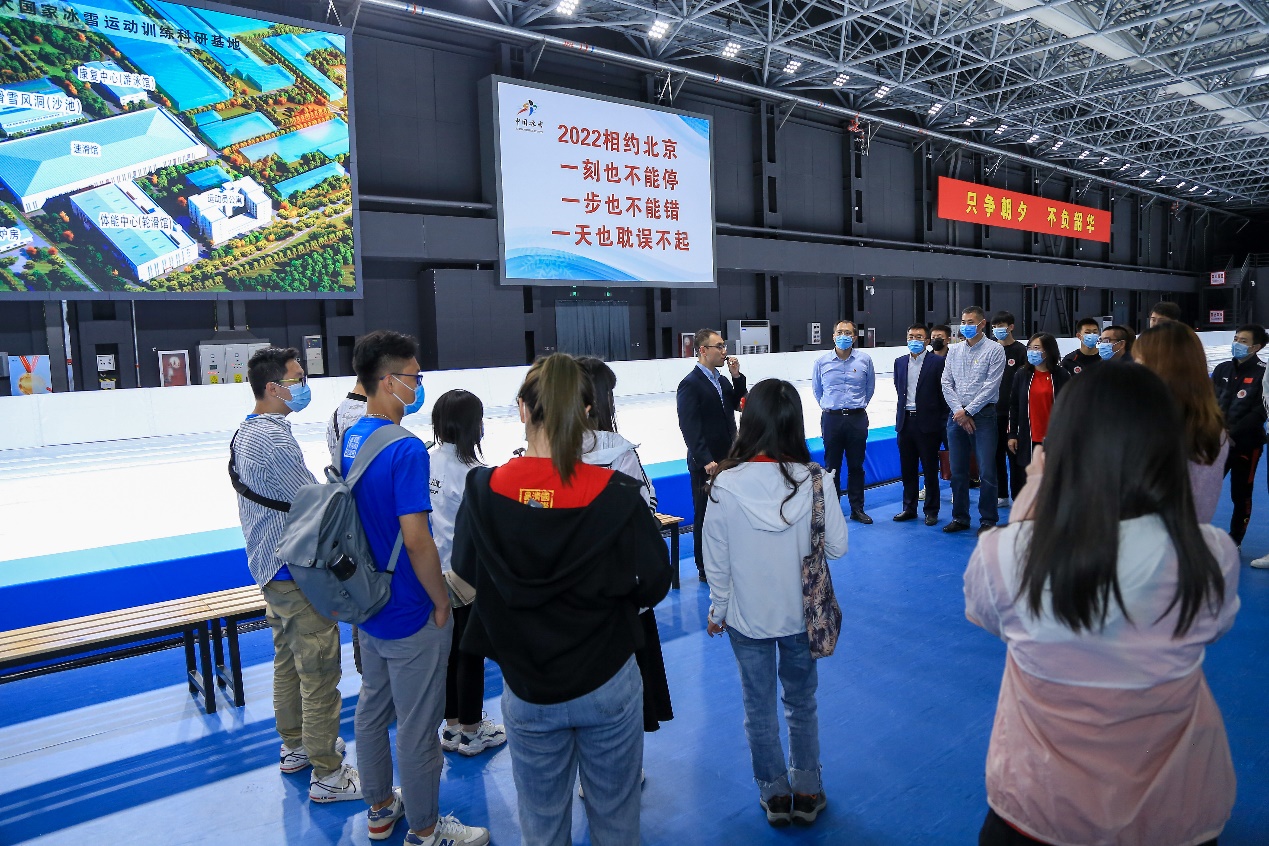 活动伊始,师生们来到基地的核心场馆——速滑馆。场馆工作人员介绍到,这座速滑馆是国内建成的第一座室内轮滑训练馆,主要用于国家速滑队进行常规辅助训练,并向同学们展示速滑馆的82根钢柱如何在技术人员的巧手设计中“变废为宝”成为建筑奇迹,奶白色的训练冰面所包含的高科技含量,以及如何经过无数次的浇筑才能为冬奥健儿提供最良好的训练环境的艰辛工作。