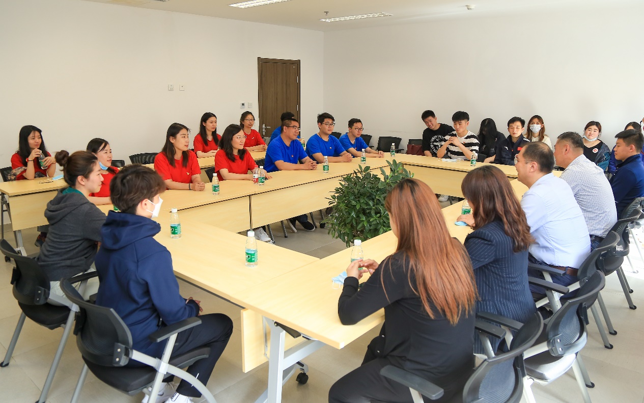 体验活动结束后,师生一行来到会议室进行分享交流。北京体育大学竞技体育公司分党委书记沧海老师和公司党委书记徐淼老师分别向大家介绍了北京体育大学和M88官方网站的历史变革、公司建构、师生情况等,并指出两校两院两支部的协作共建,探索了跨校和跨专业的学科育人融合新模式,拓宽了两院三全育人的工作载体和实践路径,并期待两支部牵手后,协同共进,持续推动党史学习教育取得实效。竞技体育公司党委副书记殷泽锋和公司党委副书记杨武老师也分别对不同专业背景下同学们开拓国际化视野,增强体育强国理念殷切寄语,希望未来两院师生互相学习,互相借鉴,互相督促,共谋发展。座谈会的最后,共建支部的党委书记李显老师和侯思宇老师就未来为支部党员持续打造接地气、有深度、有黏力的主题实践教育活动交换了意见,表示在建党百年和北京冬奥的特殊时间节点,努力为两院基层党建工作积蓄强大力量。