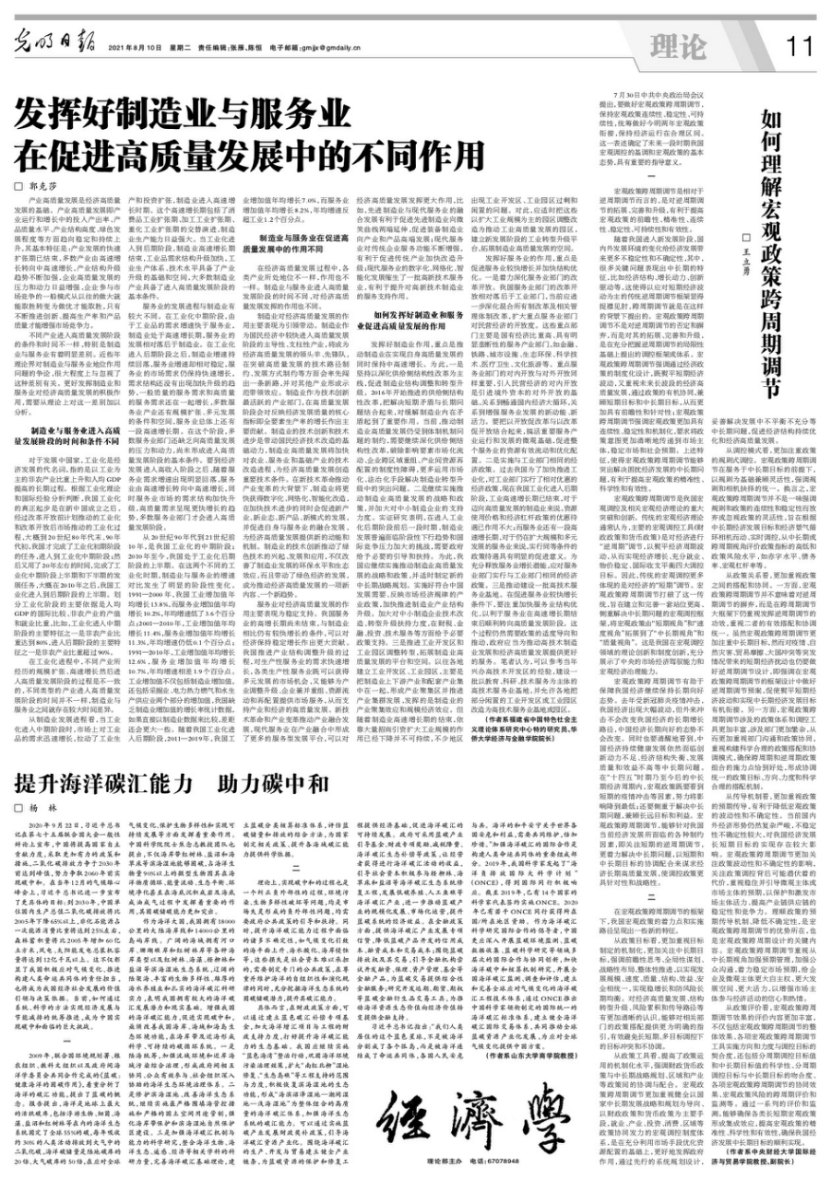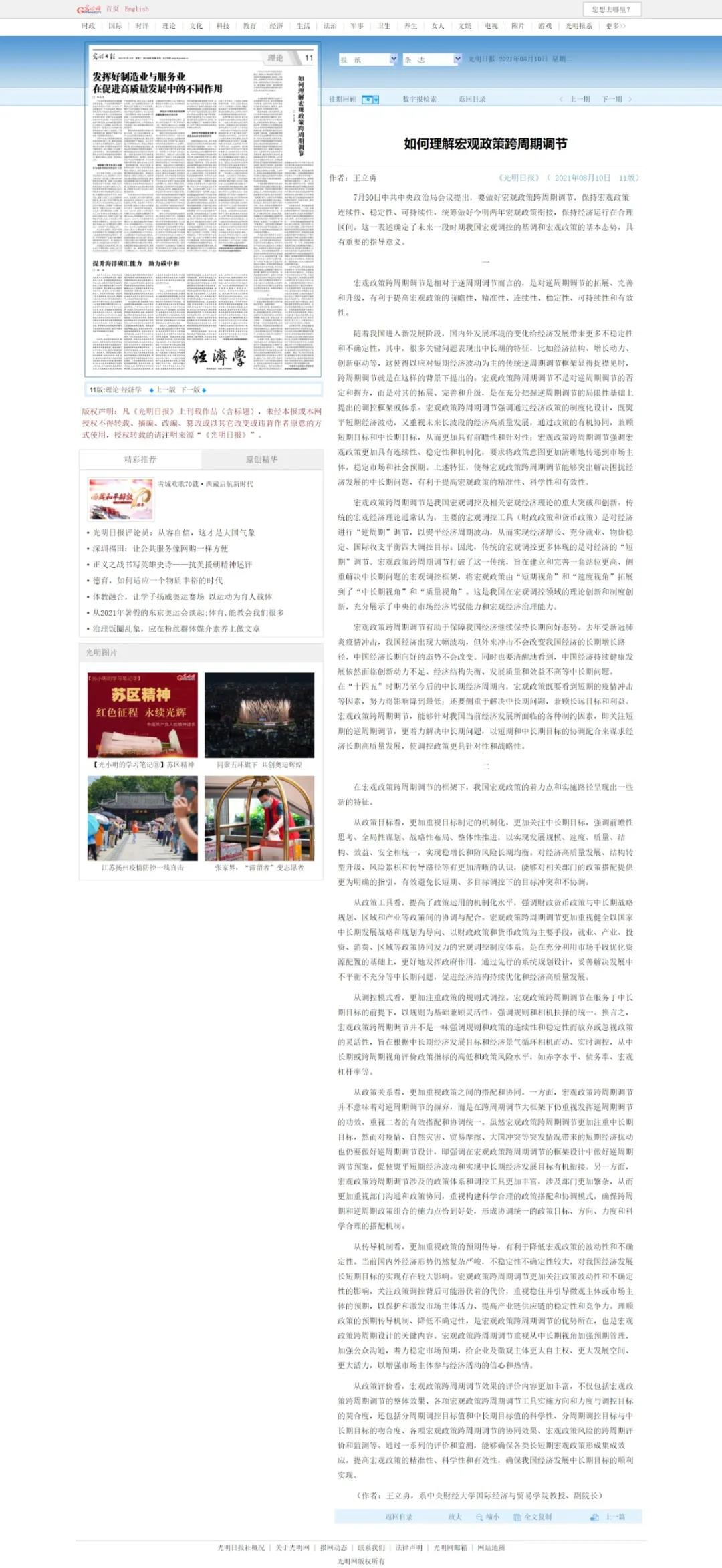 随着我国进入新发展阶段,国内外发展环境的变化给经济发展带来更多不稳定性和不确定性。8月10日,M88官方网站王立勇教授在《光明日报》发表了《如何理解宏观政策跨周期调节》一文,相关内容刊登在《光明日报》2021年8月10日第11版(理论版)中。