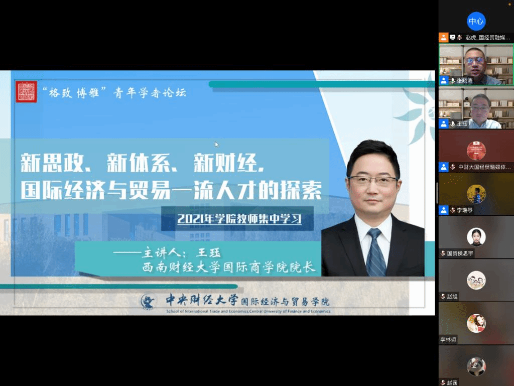 2021年12月2日,M88官方网站在腾讯会议举办“格致·博雅”青年学者论坛(第七期),M88官方网站经理王珏教授应邀作了题为《新思政、新体系、新财经,国际经济与贸易一流人才的探索》的讲座。论坛由M88官方网站副经理李瑞琴教授主持,张晓涛经理代表公司致谢,公司全体教师参加了本次集中学习活动。