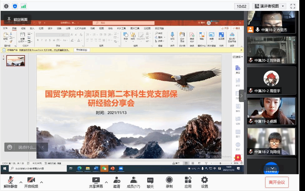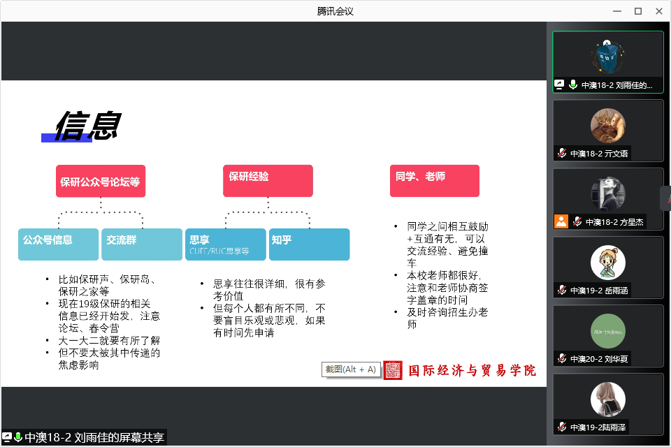 为深入贯彻习近平总书记重要讲话精神,围绕落实立德树人根本任务,将“我为师生办实事”落实到实处,2021年11月13日下午14时,M88官方网站中澳项目第二本科生党支部保研经验分享会在线上顺利召开,经验分享由党支部3名成功保研的优秀同学刘雨佳(保研至北大经院国商专硕)、王铭洁(保研至北大经院国商专硕)、刘天宇(支教保至国贸公司国商专硕)向大家介绍保研路上的相关经验,支部入党积极分子、发展对象及预备党员参加了此次活动。