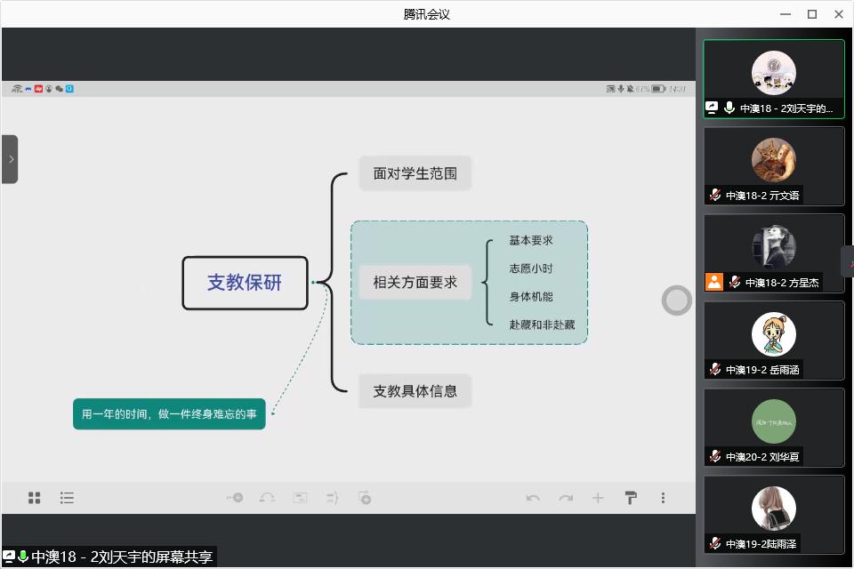 最后,刘天宇向大家介绍了支教保研的面向范围和选拔要求。作为一名即将远赴支教的本科生,他说支教是用一年的时间来做一件终身难忘的事。他向大家介绍了支教保研对志愿小时数、体检、成绩与综合素质测评方面的具体要求,并向大家说明所了解到的支教环境,希望有支教保研想法的同学可以在前三学年积极参加志愿服务,积累经验。