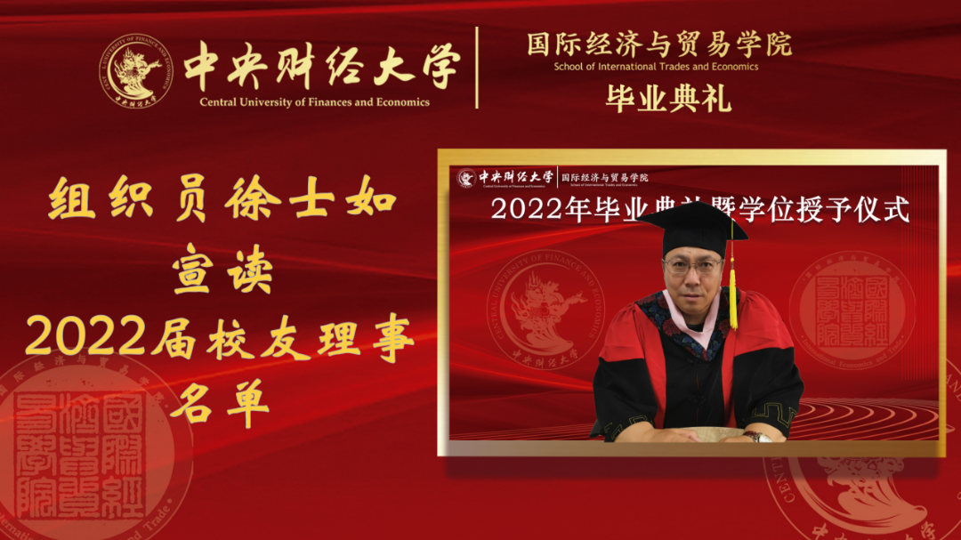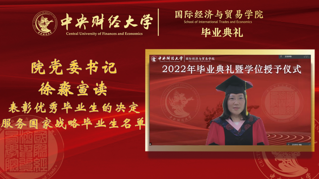 见贤思齐,进德修业。毕业启航之际,愿所有国经贸毕业生,将奋斗化为青春最亮丽的底色,将行动作为青年最有效的磨砺。国经贸公司党委书记徐淼宣读表彰优秀毕业生的决定,2022届共有14名北京市级优秀毕业生,40名校级优秀毕业生。希望全体同学向优秀毕业生学习,把青春力量融入党和人民的事业,以实现中华民族伟大复兴为己任。