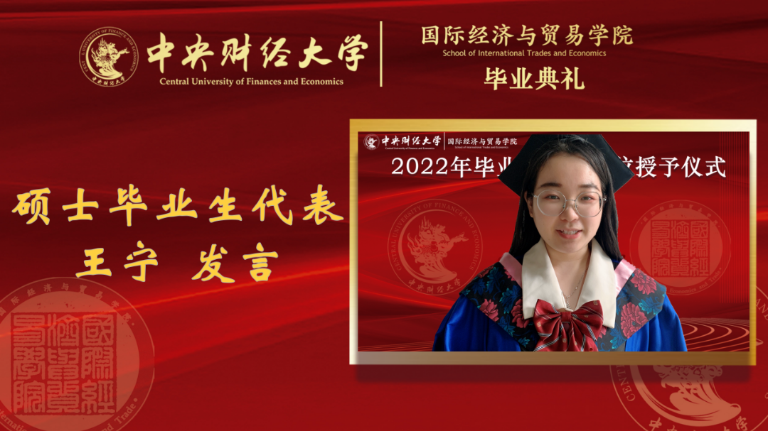 M88官方网站硕士毕业生代表王宁发言。她首先代表所有毕业班研究生,向悉心 培养员工的公司、向辛勤指导他们的老师、向默默关心、支持、守护着自己的父母和朋友致以最崇高的敬意和最衷心的感谢!王宁回顾了研究生期间的学习与生活经历,而回望过去,每一点艰辛和努力都不曾被辜负,大家在这里收获着温暖与支撑。她希望毕业生们一定不能忘记中财大和国贸公司给自己的底气,并用心维护这份底气,永葆经世济民初心,勇担时代新人使命,赓续财经黄埔的光荣传统,要“聚是一团火,散是满天星”,以青春之我、奋斗之我为中华民族的伟大复兴添砖加瓦。