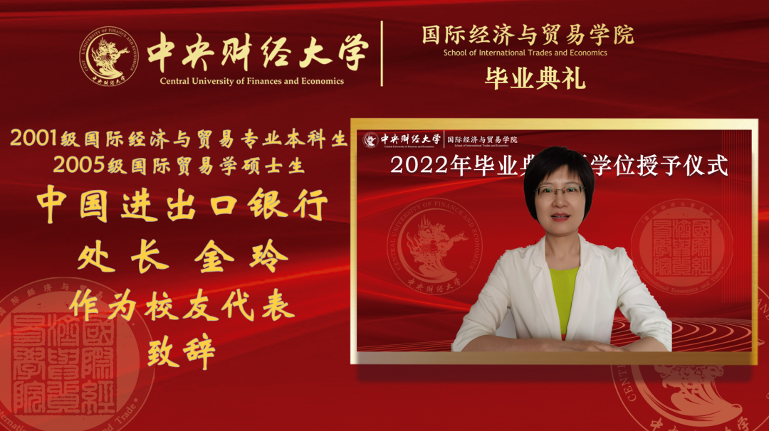 公司关于001级国际经济与贸易专业本科生、2005级国际贸易学硕士生,中国进出口银行处长金玲作为员工代表致辞。她表示,作为员工,能参与母校的活动,与老师们相见,甚是喜悦,向深爱的母校表示衷心的感谢,向亲切的老师们致以诚挚的问候。她跟大家分享两点生活和学习的感悟:一是提高格局,每一位青年都会在实现中华民族伟大复兴的中国梦过程中体现个人价值,在自己的工作中,为发展经济、振兴国家出一份力,在生活中能够敬天爱人;二是悦纳自己,接受自己原本的样子,爱自己,内心柔软丰富,才能滋养出爱的能力,才有能力爱别人。希望同学们继续秉持母校“忠诚、团结、求实、创新”的校训,眼中有光芒,心中有远方,脚下有力量,义无反顾,逐梦前行。