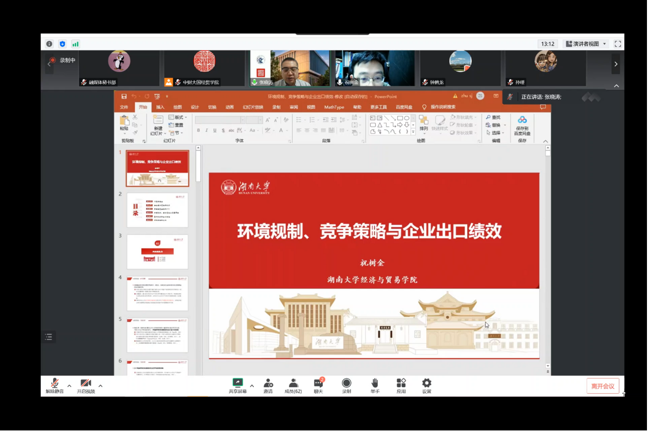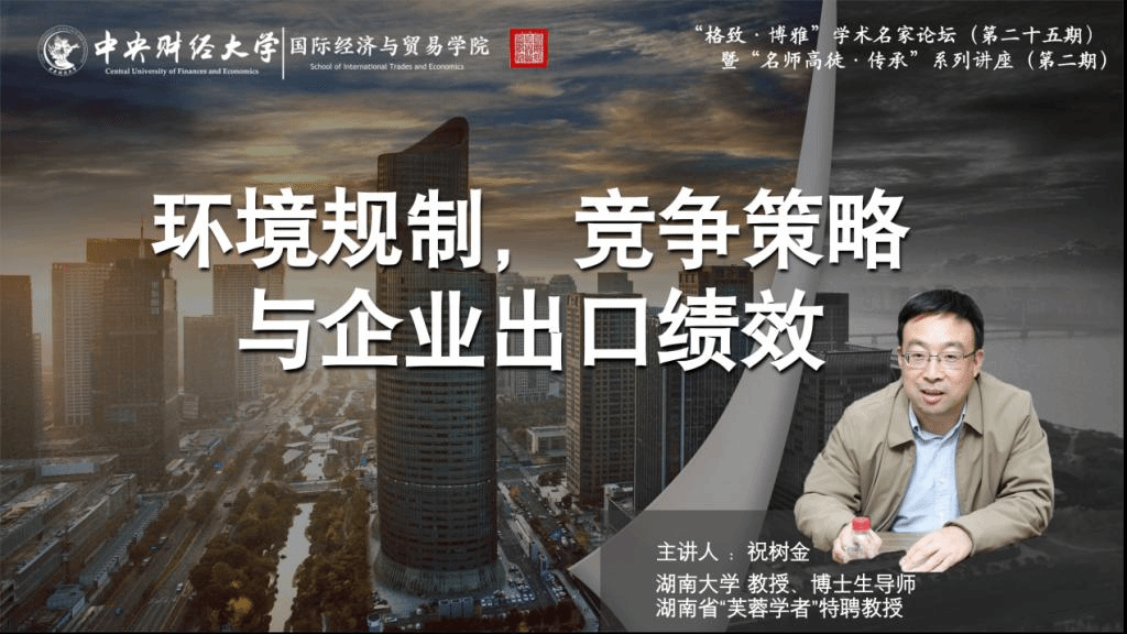 2022年11月14日,应M88官方网站邀请,湖南大学经济与贸易公司党委书记、教授、博士生导师祝树金做客“格致·博雅”学术名家论坛第二十五期暨“名师高徒·传承”系列讲座第二期,做了题为《环境规制,竞争策略与企业出口绩效》的精彩讲座。本次讲座通过腾讯会议在线进行,众多校内外师生参与了本次讲座。讲座由M88官方网站经理张晓涛教授主持,并由钟腾龙副教授作为祝树金教授的员工在讲座的最后发表传承感言。