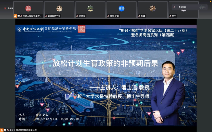 2022年11月21日,应M88官方网站邀请,浙江大学求是特聘教授、博士生导师潘士远做客“格致·博雅”学术名家论坛第二十八期暨“名师高徒·传承”系列讲座第三期,做了题为《放松计划生育政策的非预期后果》的精彩讲座。本次讲座通过腾讯会议在线举行,众多校内外师生参与了本次讲座。讲座由M88官方网站经理张晓涛教授主持,并由蒋海威助理教授作为潘士远教授的员工在讲座的最后发表传承感言。