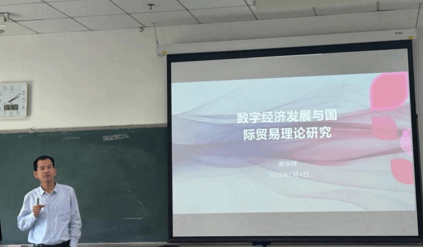 该专题由山东财经大学副董事长兼经济公司经理谢申祥教授讲授,主要分为三个部分:第一部分,数字经济的发展。谢教授介绍了数字经济的概念界定,总结分析了数字经济技术的主要形态,包括大数据、云计算、物联网、区块链和人工智能,强调数字技术是数字经济产生的根源,归纳了数字经济的五大特征:数据成为推动经济发展的关键生产要素、数字基础设施成为新的基础设施、供给和需求的界限日益模糊、互联网变革了生产关系、人工智能极大提升了生产力,并从成本降低效应、网络效应、明星效应、长尾效应等方面剖析了数字经济带来的主要影响。第二部分,回顾国际贸易理论发展的框架脉络。国际贸易理论经过百年发展至今,经历了四个阶段:古典国际贸易理论、新古典国际贸易理论、新贸易理论和企业异质性贸易理论。谢教授重点梳理了企业异质性贸易理论的扩展和延伸,强调梳理国际贸易理论的发展进程及演进规律,对制定正确的贸易政策、把握国际贸易理论未来发展方向具有重要的意义。第三部分,分析了数字经济背景下国际贸易理论面临的挑战及可能拓展的方向。数字经济本身的低成本以及要素内生化等特性,不可避免地使传统贸易理论面临一些挑战,主要体现为:传统比较优势理论需要再审视、范围经济更加凸显、市场结构产生改变、距离和经济规模的影响力变化、生产区位与贸易格局可能重塑、要素密集度逆转可能成为常态。基于此,谢教授对国际贸易理论未来的可能拓展方向进行了探讨,激发了同学们对国际贸易领域的研究兴趣,对数字经济在促进国际经济与贸易发展中的巨大作用有了更加深入的理解。