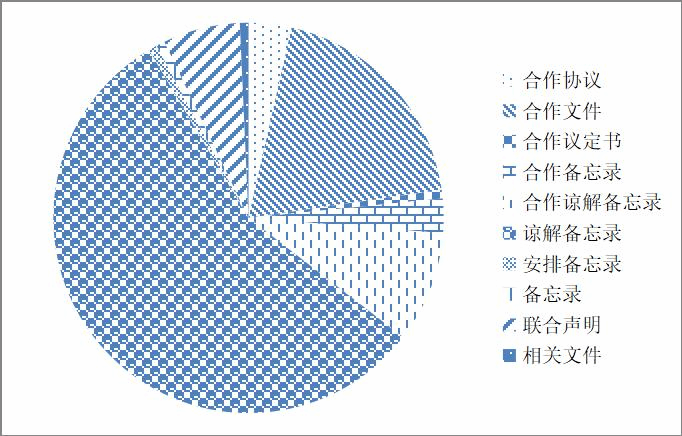 合作文件大致可以分为备忘录、联合声明、合作协议、合作文件以及合作议定书几大类。其中,谅解备忘录的占比最高,已经超过了一半的比例,而合作协议的比例很小(见图2)。这意味着中国与“一带一路”沿线国家之间的合作发展潜力及上升空间很大。