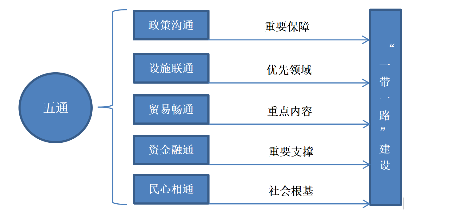 习近平主席提出:构建“丝绸之路经济带”要创新合作模式,加强“五通”,即政策沟通、设施联通、贸易畅通、资金融通与民心相通,以点带面,从线到片,逐步形成区域大合作格局。其中,深化政策沟通是共建“一带一路”的行动先导与重要保障(见图1)。