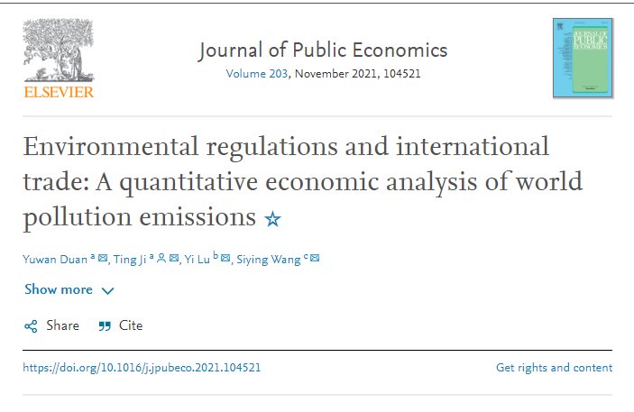 公司教师段玉婉副教授、纪珽副教授和清华大学陆毅教授、加拿大不列颠哥伦比亚大学(UBC)博士研究生王思莹合作的研究成果“Environmental Regulations and International Trade: A Quantitative Economic Analysis of World Pollution Emissions”近日被公共经济学顶刊Journal of Public Economics(中财外文AAA)在线发表。