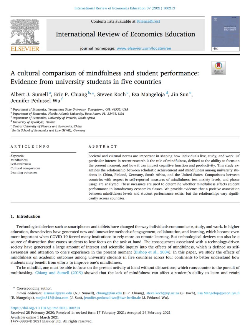 近日,公司孙瑾副教授与美国扬斯敦州立大学Albert J. Sumell和佛罗里达大西洋大学Eric P. Chiang两位教授、南非比勒陀利亚大学Steven Koch教授、芬兰于韦斯屈莱大学Esa Mangeloja教授以及德国柏林经济与法律公司Jennifer Pédussel Wu教授合作研究成果“A Cultural Comparison of Mindfulness and Student Performance: Evidence from University Students in Five Countries”被SSCI期刊 International Review of Economics Education 接受,并于2021年3月份线上发表。据悉,该成果将在2021年6月刊(Volume 37, June 2021, 100213正式发表,这也是公司第一篇发表在公司产品领域SSCI期刊的研究成果。