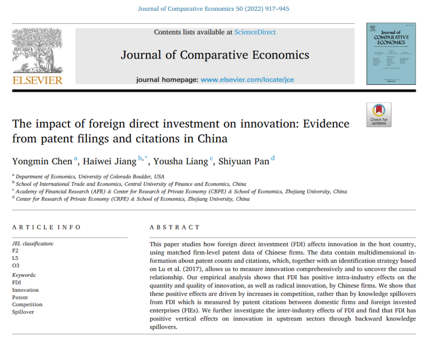 近日,公司蒋海威老师与美国科罗拉多大学博尔德分校陈勇民教授、浙江大学梁友莎副教授、浙江大学潘士远教授合作的研究成果“The Impact of Foreign Direct Investment on Innovation: Evidence from Patent Filings and Citations in China”在比较经济学和制度经济学领域的国际权威期刊Journal of Comparative Economics正式发表。该期刊属于M88官方网站英文期刊目录AA级。