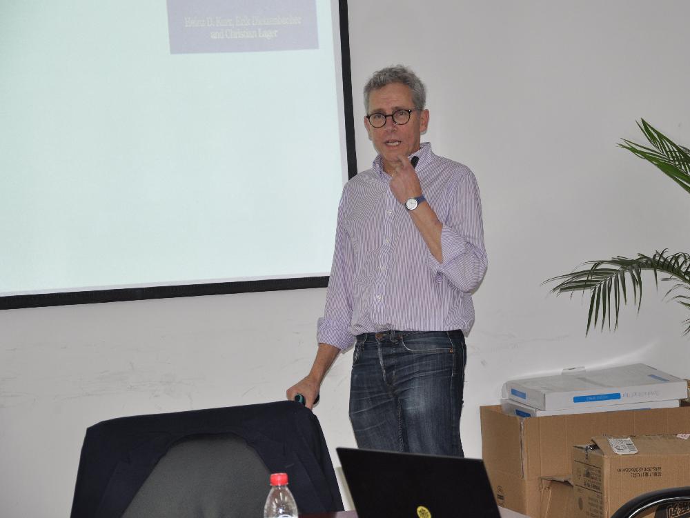 讲座中,Dietzenbacher教授从历史维度,对全球价值链领域的研究背景、研究问题、研究方法、研究结论和面临的挑战进行了系统的梳理、总结和评价,并重点针对全球价值链背景下的环境生态问题研究给予了详细的剖析和讲解,对全球价值链研究的未来走向和热点问题进行了判断和总结。参会师生与Dietzenbacher教授就讲座内容进行了深入讨论与交流;Dietzenbacher教授生动深入的讲解和诙谐幽默的语言极大激发了在场师生的研讨热情,现场不时发出共鸣的笑声,整个讲座现场座无虚席、气氛活跃、讨论热烈。