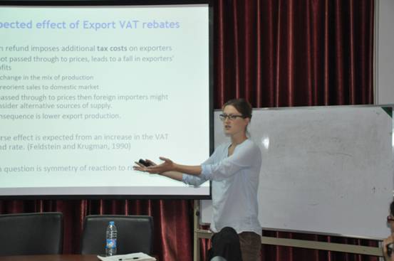 Poncet教授的讲座主要探讨了中国出口增值税退税制度对中国出口的影响。她指出,出口增值税退税正日益成为中国产业政策的一项重要工具,其特殊性来自于国内增加税补偿的不完善性,也就是说“中国的出口商为中间产品缴纳增值税,但是最后很有可能拿不到全部增值税退税。”她进一步指出,与货币政策、补贴、贸易保护等其它公开的干预政策不同的是,对于中国退税制度错综复杂的影响研究并没有引起学术界足够重视。她们的研究意义正在于提供了精确测量中国近十年增值税退税税率频繁调整的巨大影响的有效方法。