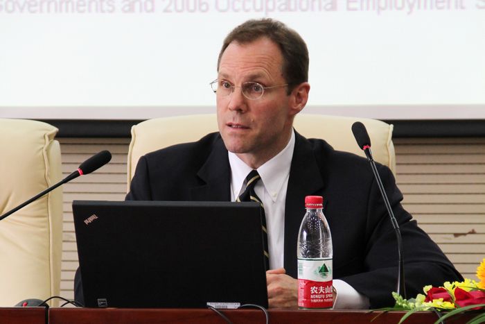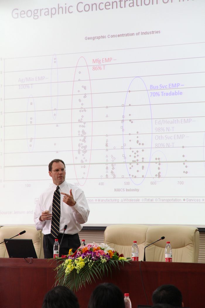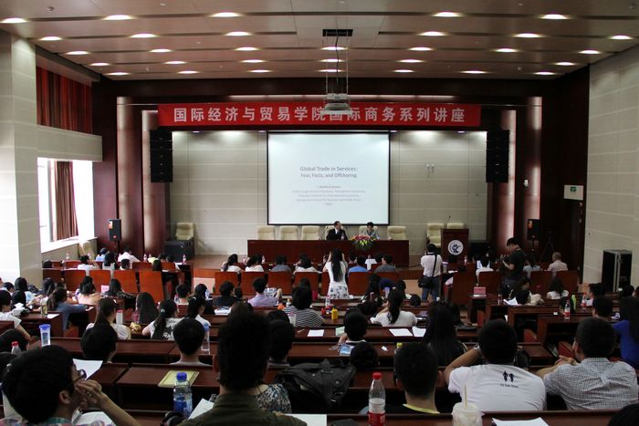 座谈会后,Jensen教授在学术会堂202报告厅做了一场精彩的讲座,题目是“Global Trade in Services: Fear, Facts, and Offshoring”。