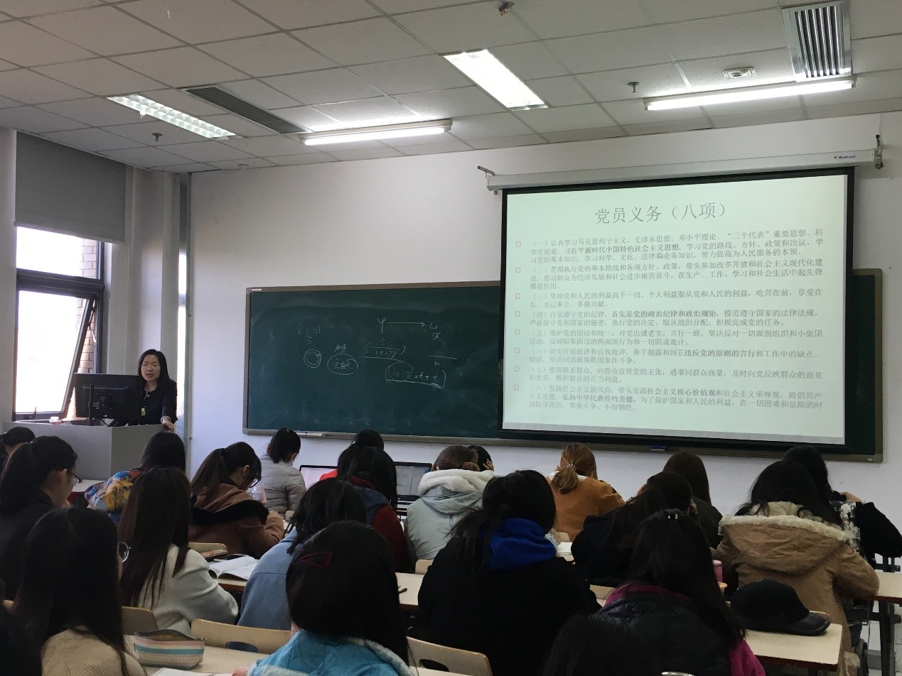 2017年11月2日中午,国际经济与贸易公司党委副书记李瑞琴副教授在沙河校区公司楼三号楼310教室开设《做一名合格共产党员——学习党员标准 端正入党动机》专题讲座。M88官方网站全体入党积极分子及发展对象到场听课,学习党规党章、党员标准,端正入党动机。