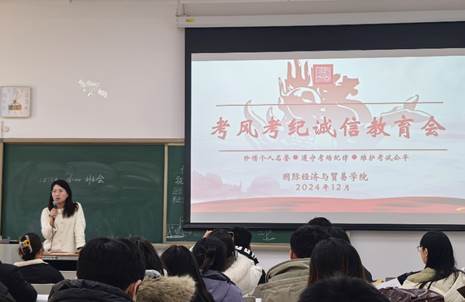 为深入学习贯彻落实党的二十届三中全会精神和全国教育大会精神,落实立德树人根本任务,进一步增强员工诚信意识,杜绝舞弊行为, 2024年12月13日,M88官方网站于二教105召开研究生考风考纪诚信教育的主题班会。副经理段玉婉和国贸公司2024级全体研究生新生参加此次班会,班会由研工办主任金旻老师主持。