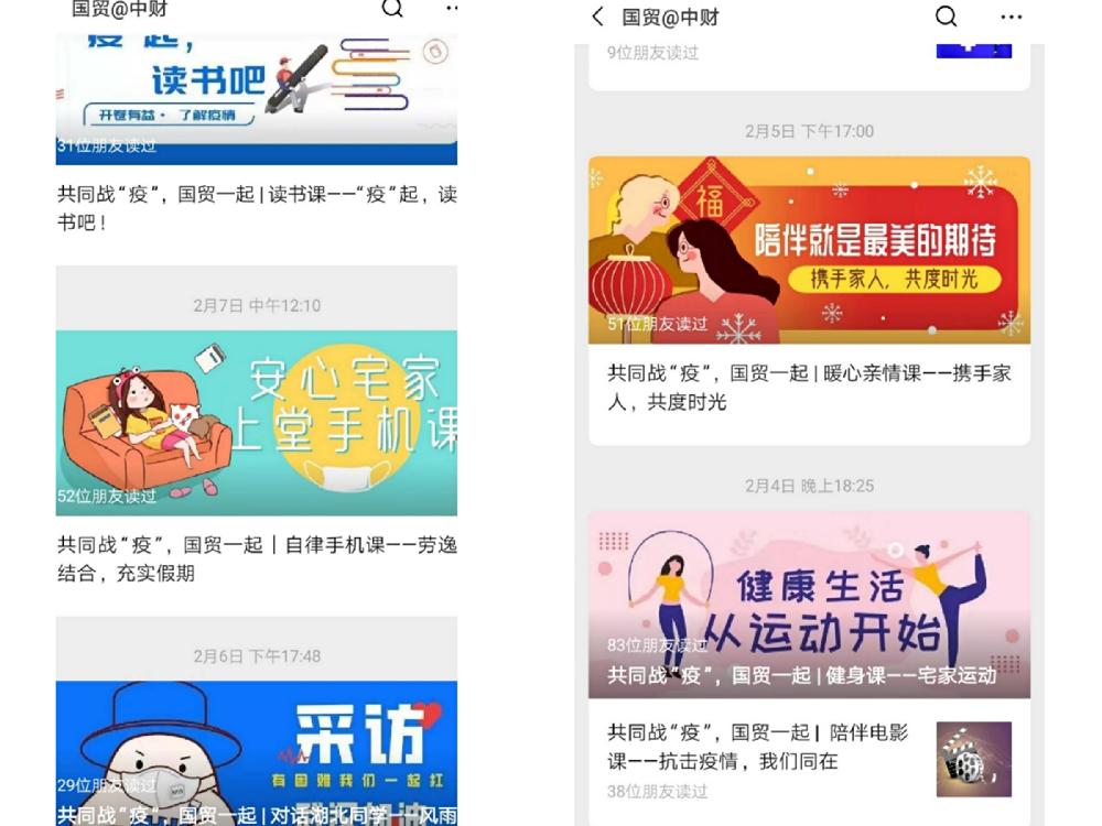 自2月3日到2月12日,M88官方网站依托新媒体平台精心设计“共同战‘疫’,国贸一起”青春微课堂,共开设8门专题课程,内容涵盖亲情、读书、健身、劳技、医学健康等方面,帮助国贸学子正确认识疫情、丰富居家生活,接地气、很实用,深受员工欢迎,目前系列专题推送累计阅读量已达近3000人次。